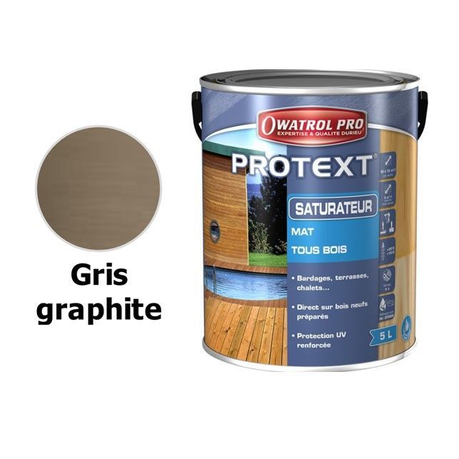 | Meta Description | Saturateur mat Owatrol Protext Gris Graphite 5L : protège durablement bois durs et tendres extérieurs contre UV et intempéries, avec une finition mate contemporaine non filmogène. |